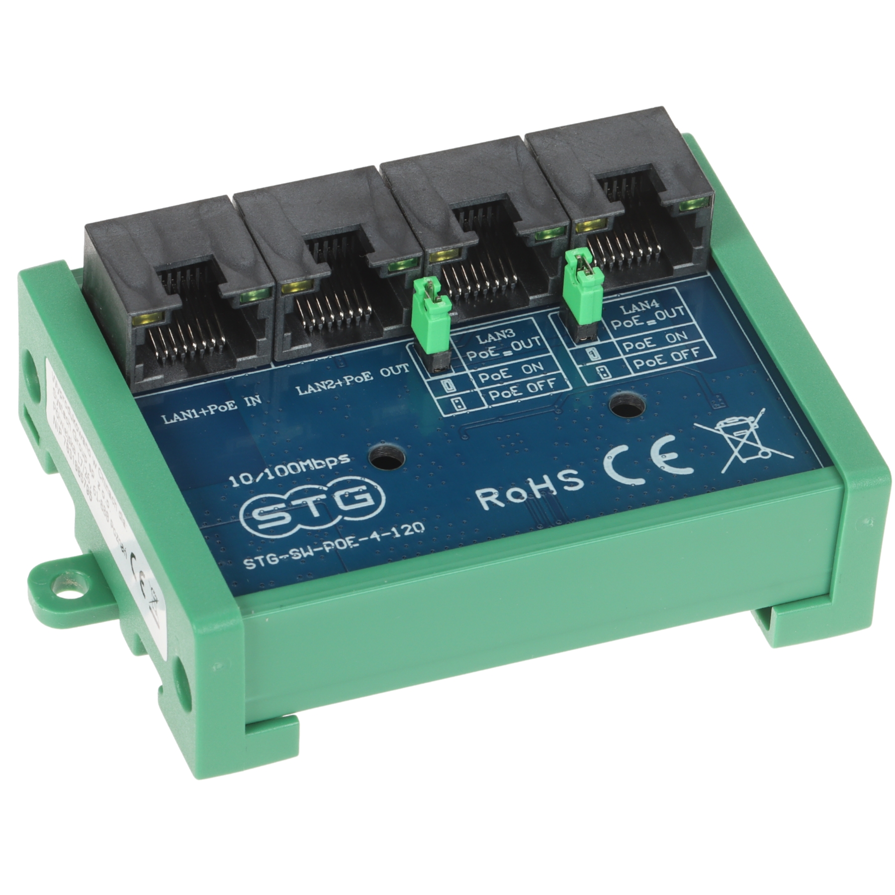 STG-SW-POE-3-110 został zaprojektowany jako standardowy switch PoE, który zasilany jest z jednego portu (LAN+POE1). Dzięki możliwości zasilania z jednego portu i przekazywaniu zasilania na pozostałe dwa porty, może realizować funkcję przedłużacza (extendera LAN/PoE) i umożliwiać podłączanie urządzeń na sumaryczną odległość 200 metrów.
